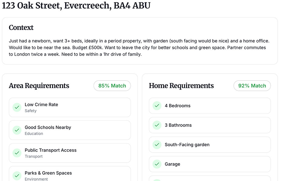 Uprooting listings include rich home and area context, key facts, and a clear match summary. Buyers arrive better informed, ask better questions, and waste less time.